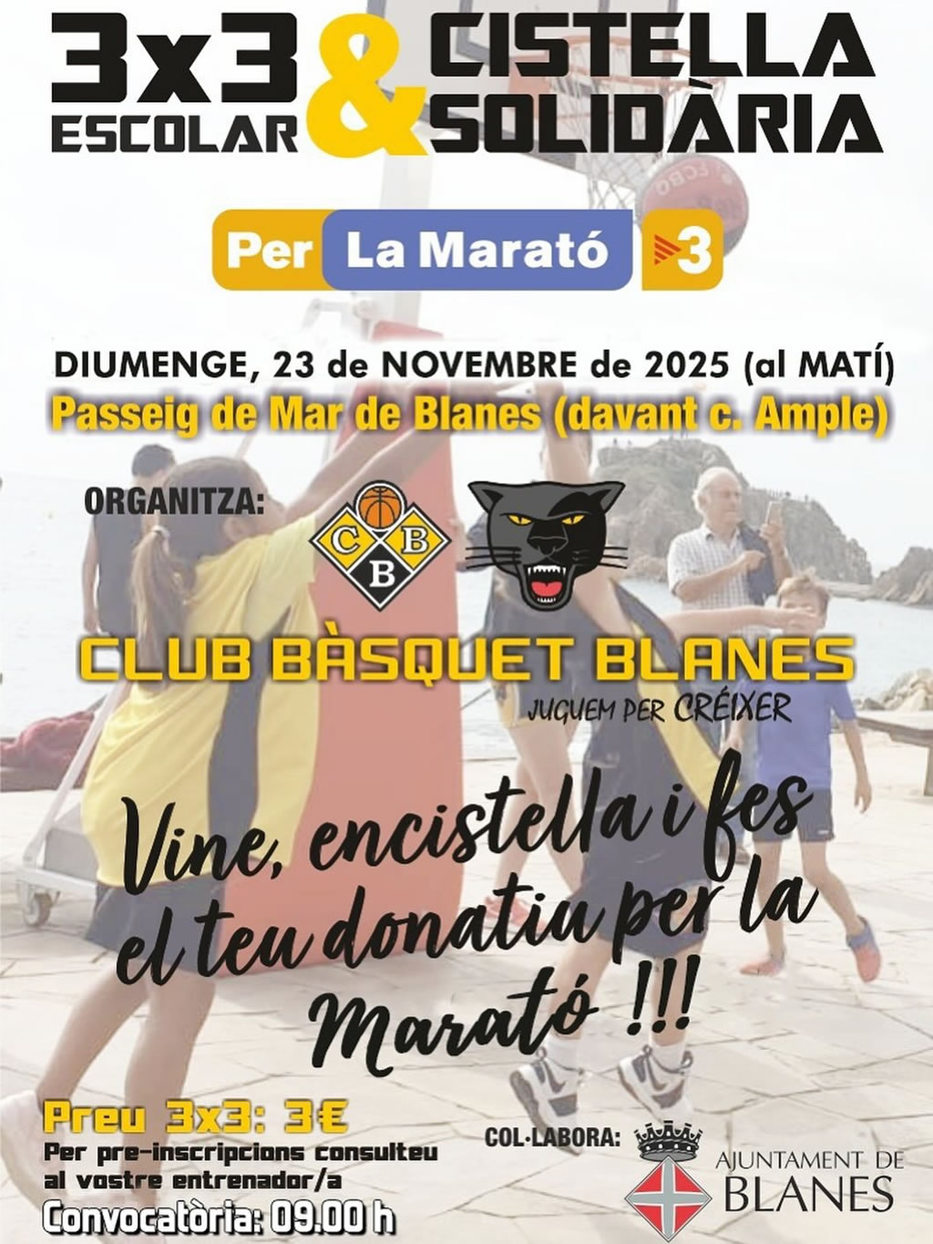 Ja ho tenim tot preparat per a una nova edició del nostre 3×3 escolar solidari en suport a La Marató de TV3! Un any més, el Club Bàsquet Blanes s’uneix per gaudir del bàsquet mentre fem una passa endavant per una causa solidària. 🖤💛