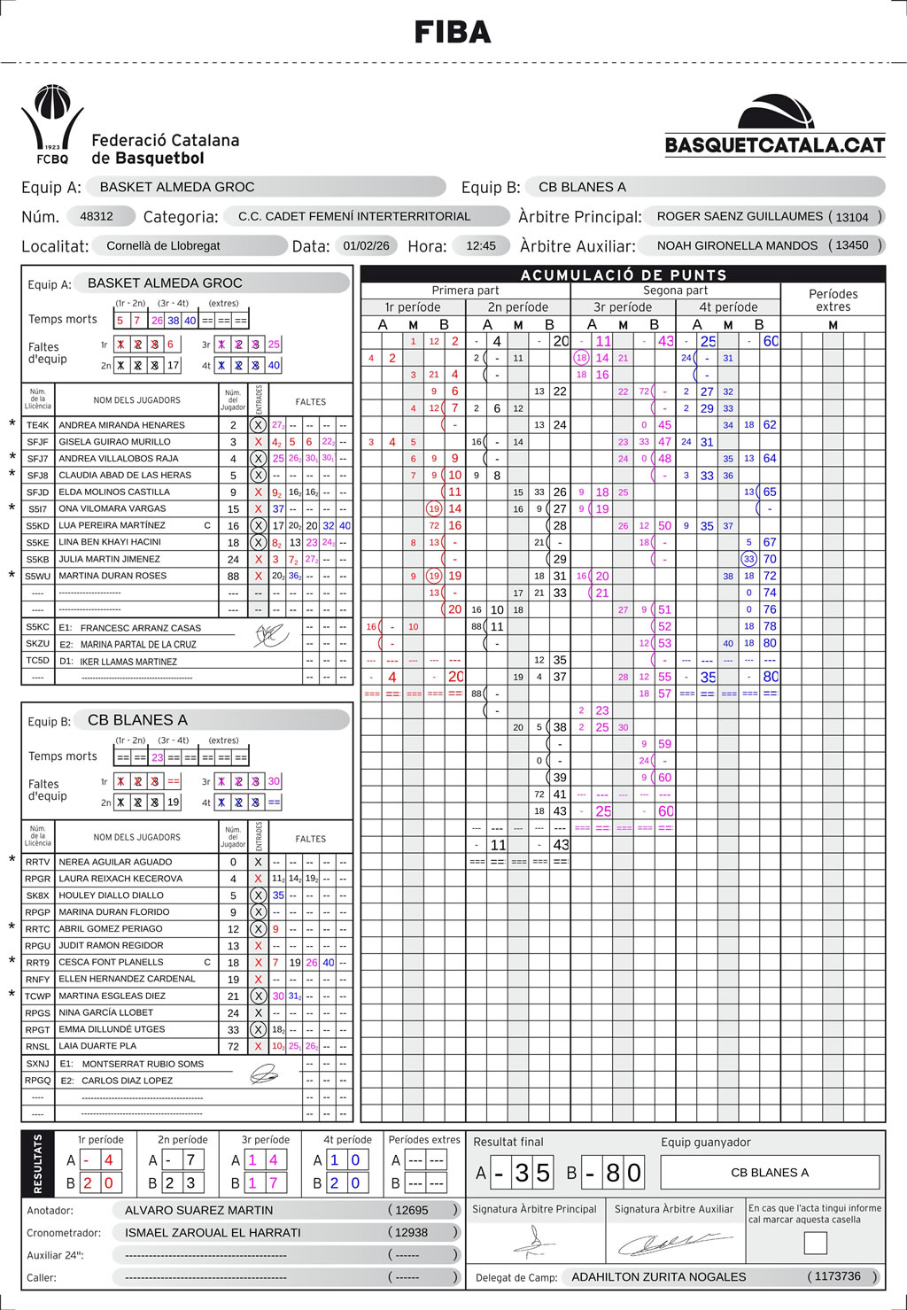 L’equip ha signat una actuació espectacular a la pista del Basket Almeda, en un partit disputat a Cornellà que ha estat dur en tots els sentits: per la intensitat del joc i també per l’ambient a les grades. Les nostres jugadores s’han mostrat súper unides, concentrades i molt ben posicionades des del primer minut. El marcador final, 35–80, reflecteix clarament el domini del Blanes al llarg de tot l’enfrontament.