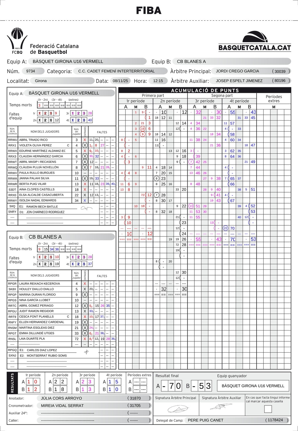 | Bàsquet Girona | 10 | 22 | 23 | 15 | 70 |