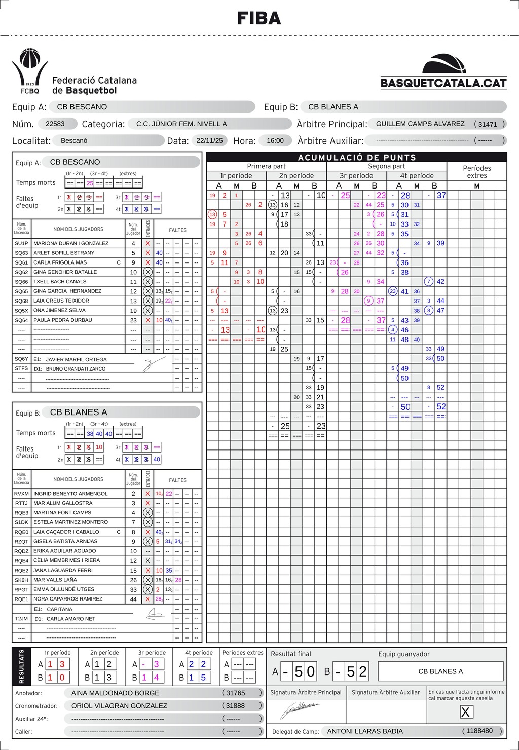 | C.B. Blanes | 10 | 13 | 14 | 15 | 52 |