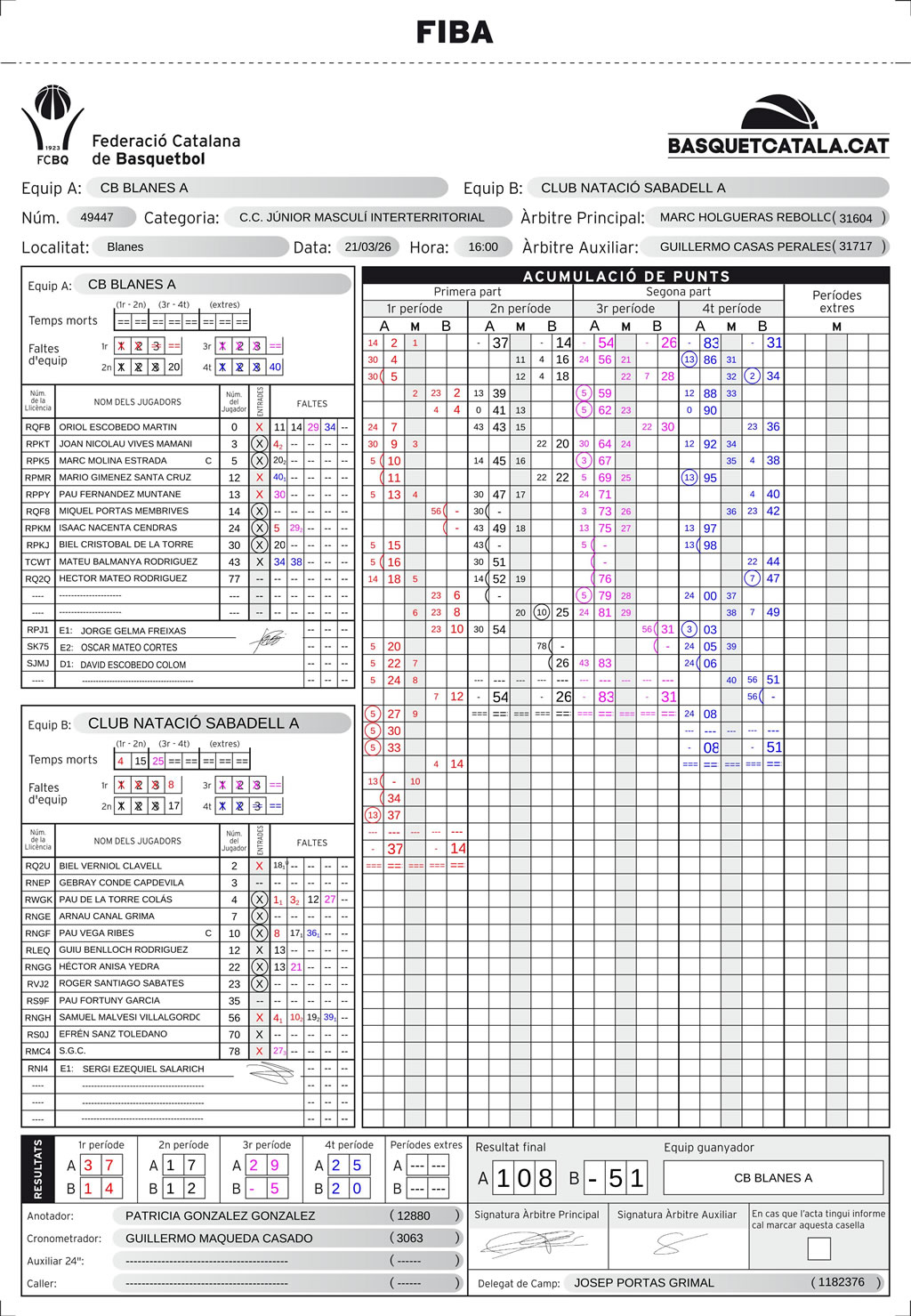 El Júnior A no perdona i passa per sobre d’un desdibuixat C.N. Sabadell. El Blanes més encertat de la temporada va sortir a per totes des del primer minut del partit. El Sabadell, per la seva banda, no va saber com frenar a uns locals encertadíssims que van aconseguir anotar 37 punts en un primer quart impecable.