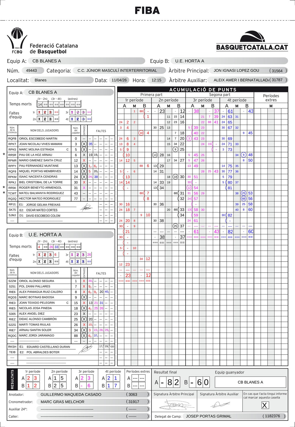 | C.B. Blanes | 23 | 15 | 23 | 21 | 82 |