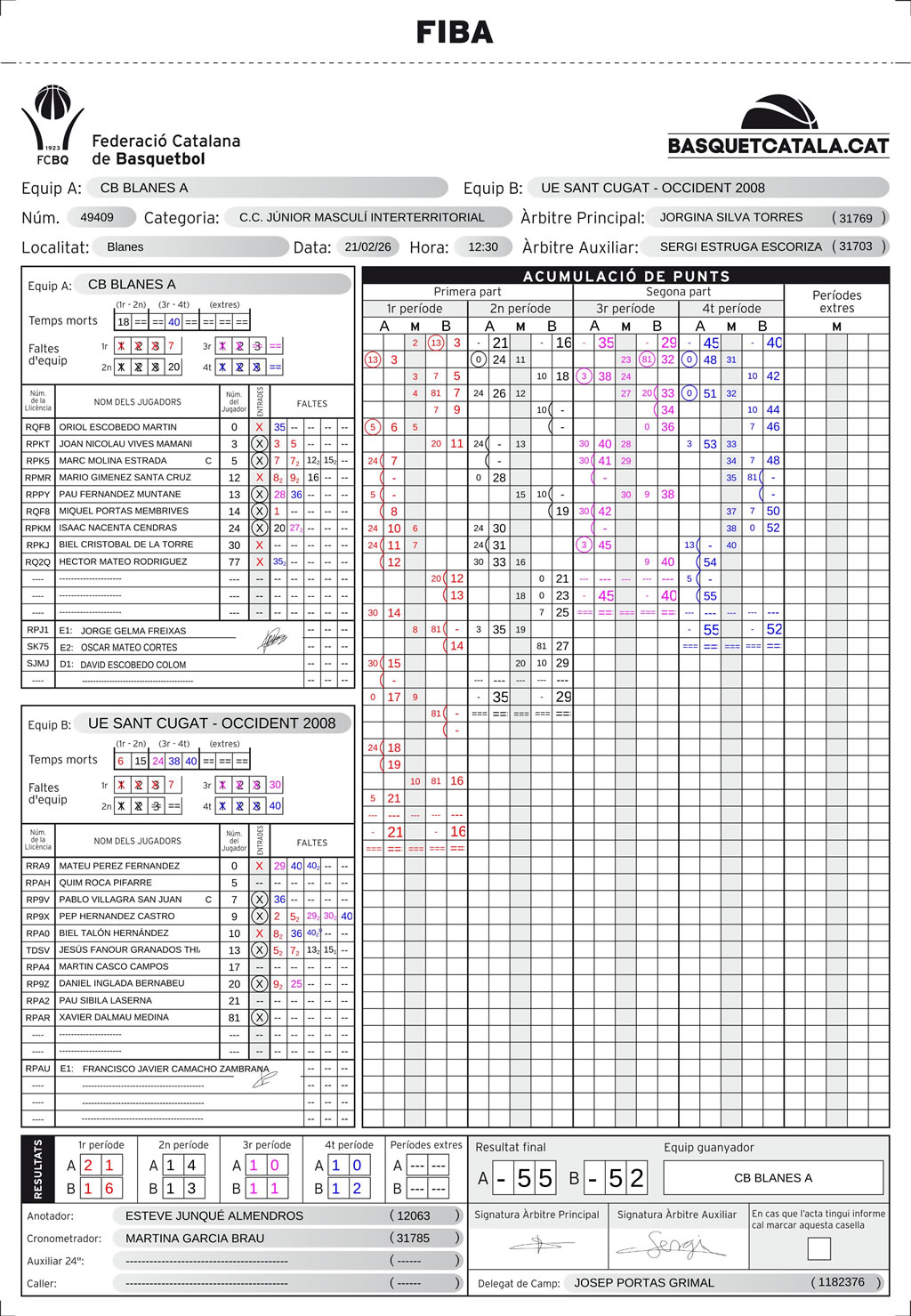 | U.E. Sant Cugat | 16 | 13 | 11 | 12 | 52 |
