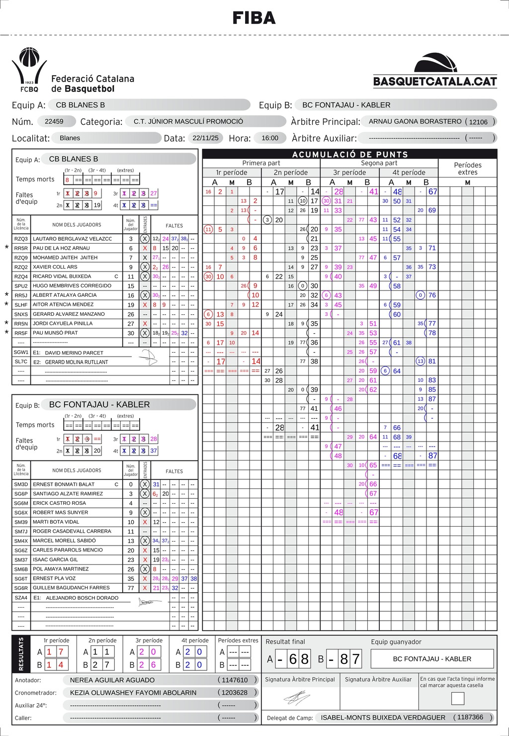 El primer quart l’hem guanyat (17-14). Tot just començar el 2n. quart ens han clavat un triple i han empatat el partit. A partir d’aquí han començat a agafar avantatge i hem marxat al descans amb tretze punts per sota. Al tercer període ens hem posat les piles i hem sortit més agressius, hem aconseguit posar-nos només a 4 punts. Però els fantasmes han aparegut i en pocs minuts l’equip contrari ha tornat a agafar una avantatge de 12 punts, marxant finalment al quart període 19 punts per sota. L’últim quart ha sigut més igualat, però al Fontajau, l’avantatge aconseguida fins aleshores els hi ha servit per guanyar el partit.