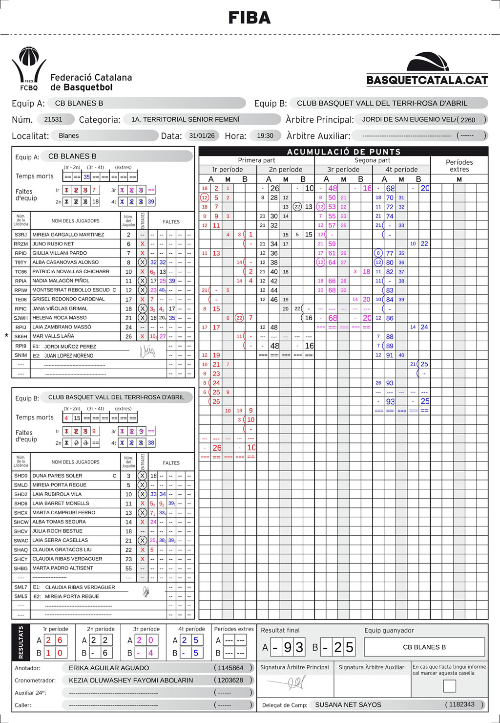 | C.B. Blanes | 26 | 22 | 20 | 25 | 93 |