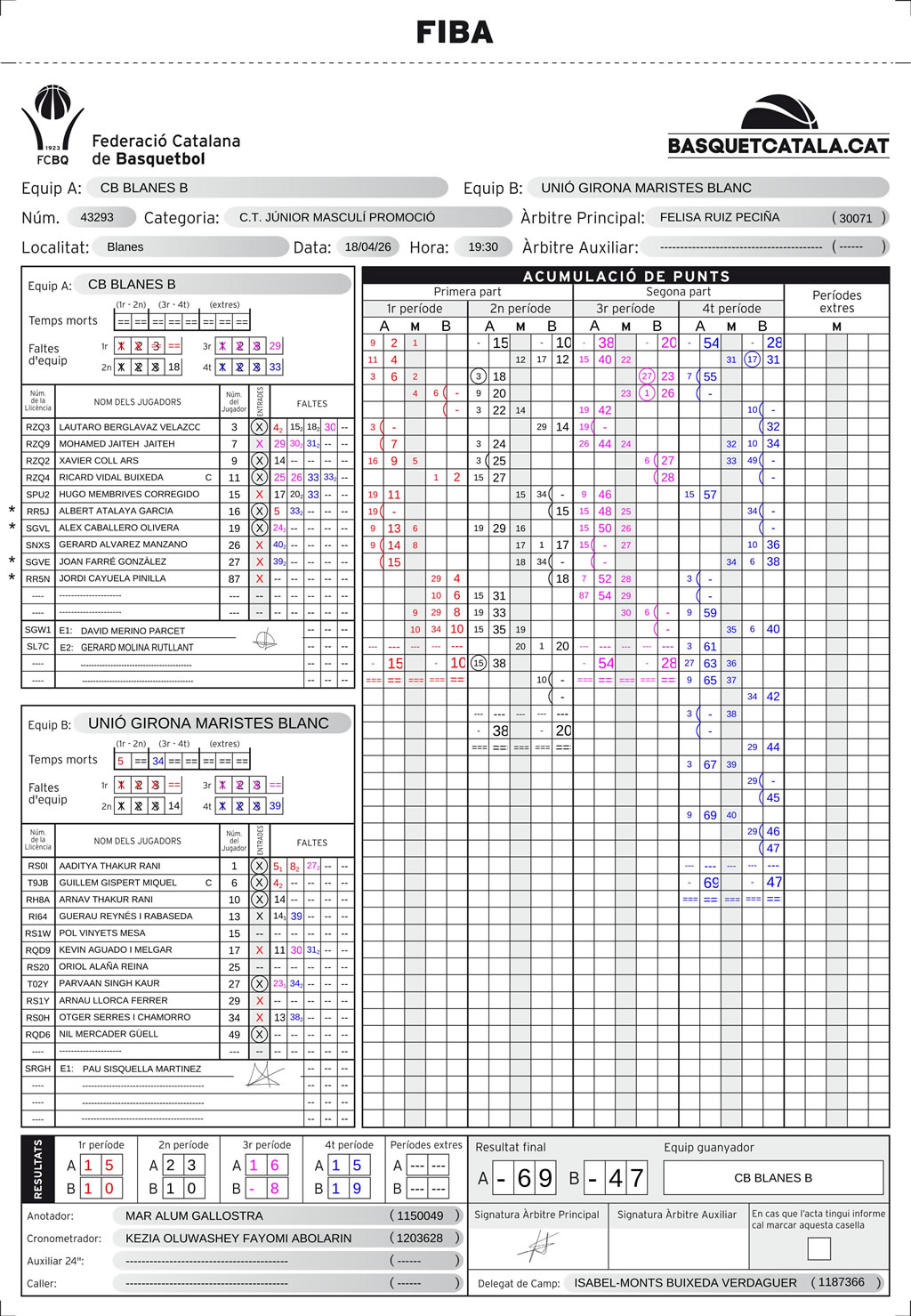 | C.B. Blanes | 15 | 23 | 16 | 15 | 69 |