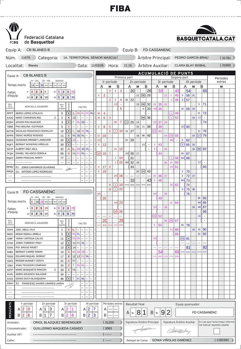 | C.B. Blanes | 20 | 13 | 21 | 27 | 81 |