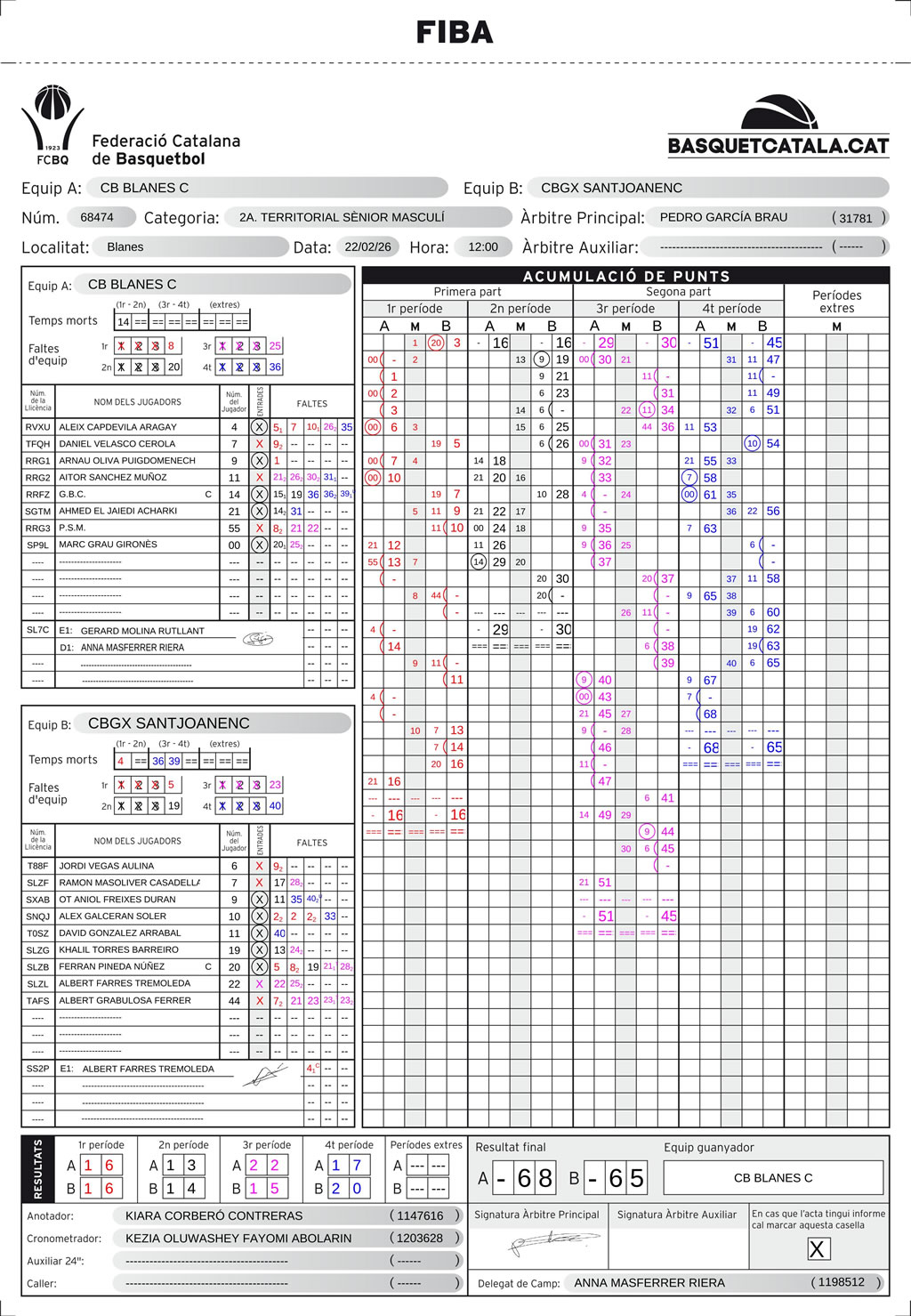 | C.B. Blanes | 16 | 13 | 22 | 17 | 68 |