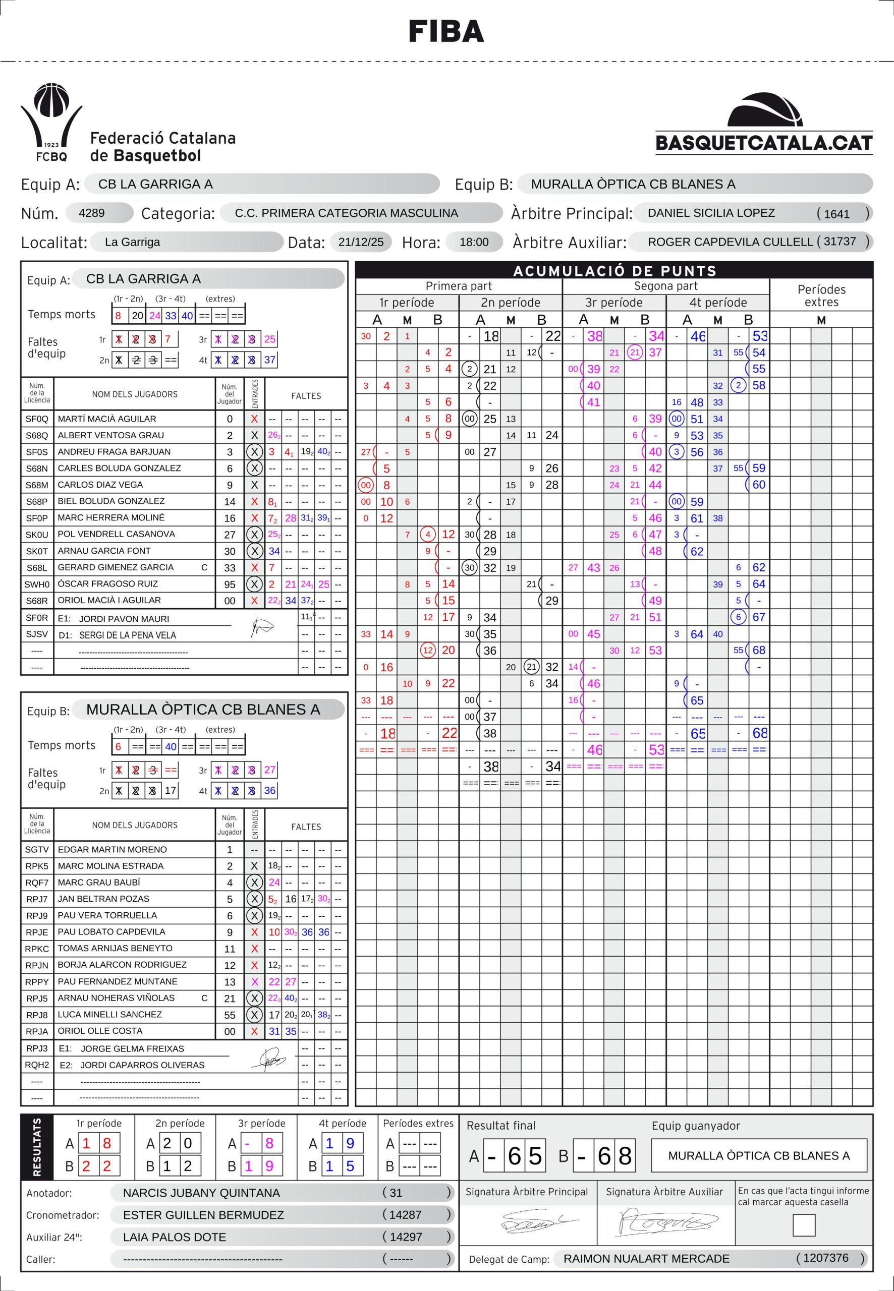 L’últim quart va ser de màxima igualtat i tensió. La Garriga ho va intentar fins al final (19-15), però el Blanes va saber gestionar els moments clau del partit, mantenir el cap fred i assegurar una victòria treballada per 65 a 68.