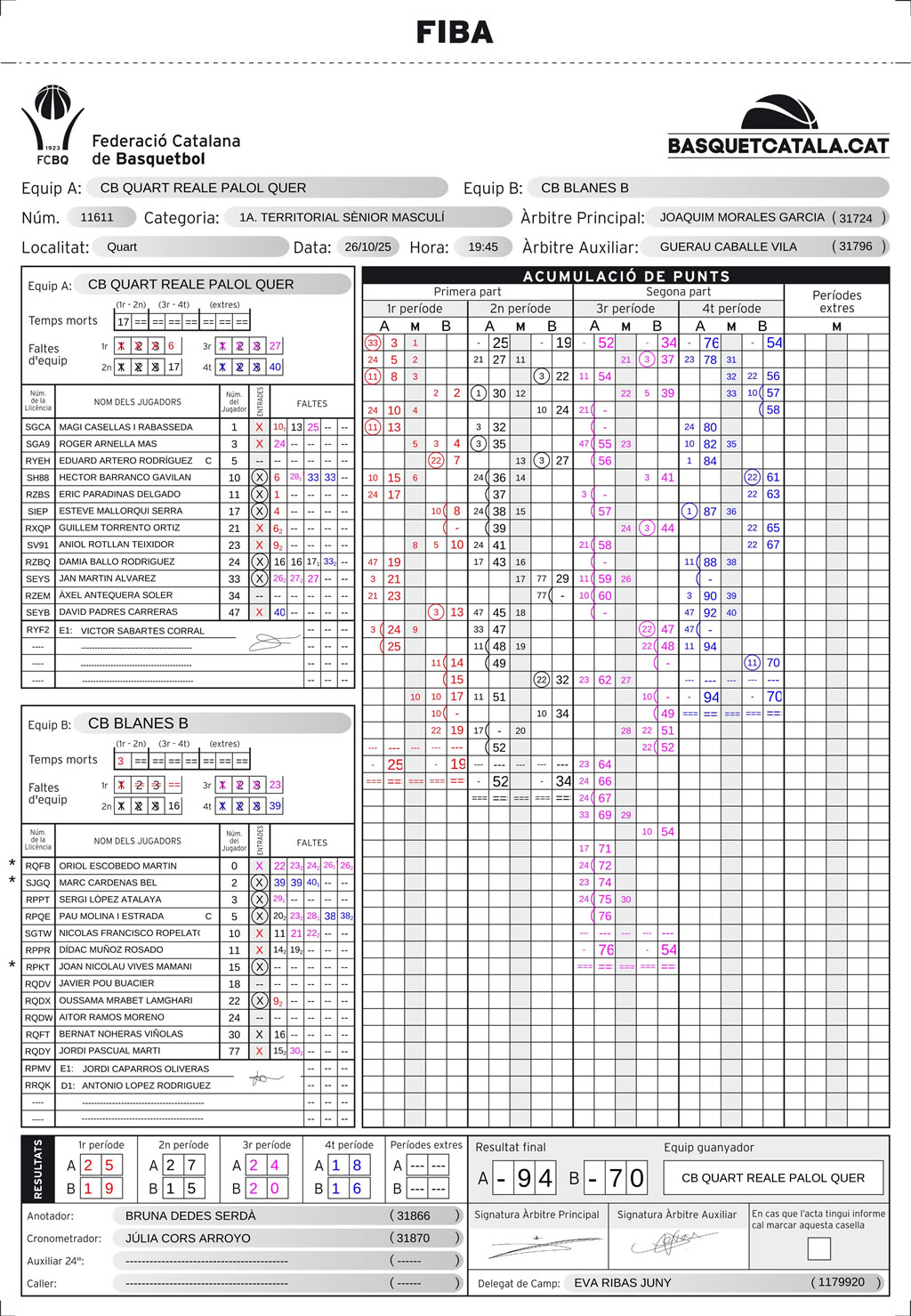 | C.B. Blanes | 19 | 15 | 20 | 16 | 70 |