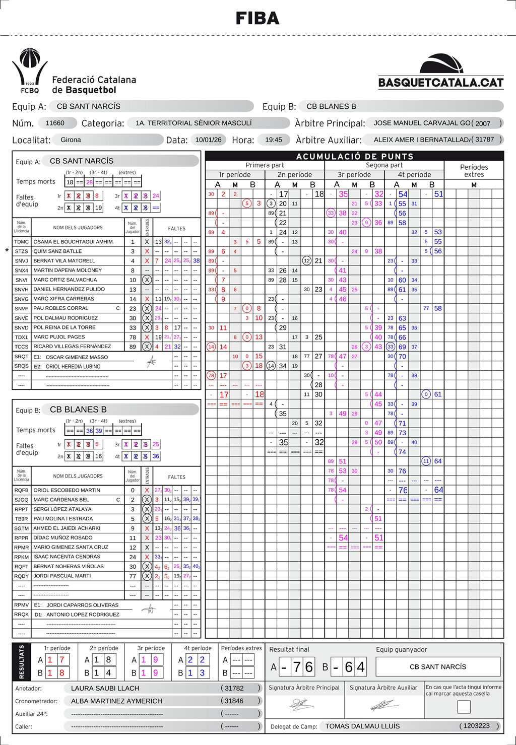 El primer període va ser un intercanvi de cops constant, amb un 17-18. Al segon, el Sant Narcís va intentar apretar línies, però el Blanes es mantenia ferm en la circulació i en el rebot, arribant al descans amb un ajustat 35-32.