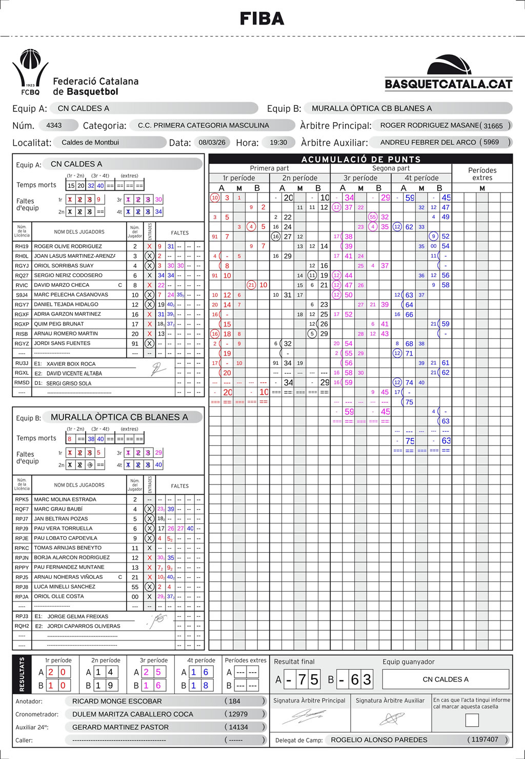 | C.N. Caldes | 20 | 14 | 25 | 16 | 75 |