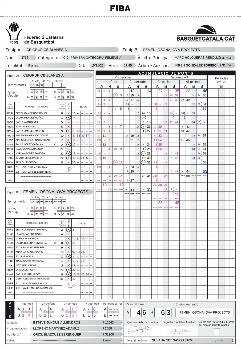 Tot i l’encert superior de l’Osona, especialment en moments clau, el Blanes va mostrar orgull, solidesa defensiva i un esperit indestructible. Accions de sacrifici, defenses de manual i cistelles de pur coratge van mantenir l’equip dins del partit fins al final.
