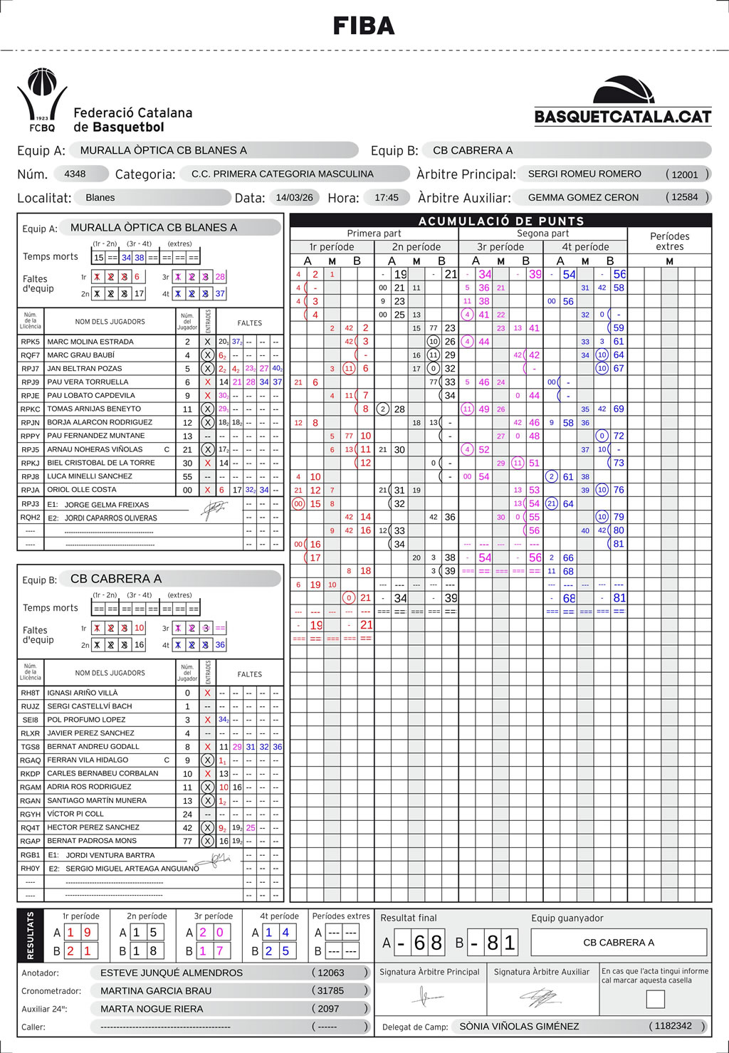 | C.B. Blanes | 19 | 15 | 20 | 14 | 68 |