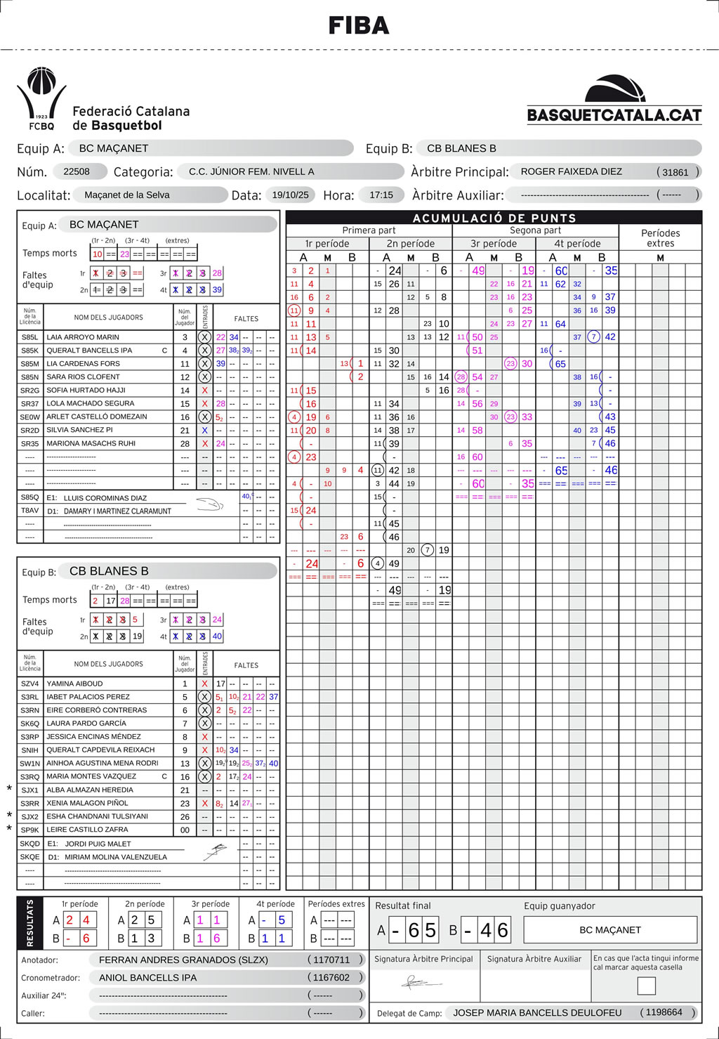 Un començament de partit molt fluix, desordenat amb males jugades. Amb un primer quart 24-6 que ens va servir per despertar i enfocar-nos en el partit, es destaca la lluita i l’entrega fins a l’últim moment. A poc a poc es va observant millores i durant el partit comparat amb partits anteriors es va notant el que s’ha après i a saber sobreposar-se al desavantatge del marcador. La lluita per remuntar es va viure amb intensitat, no es van rendir fins les acaballes del matx 65-46.