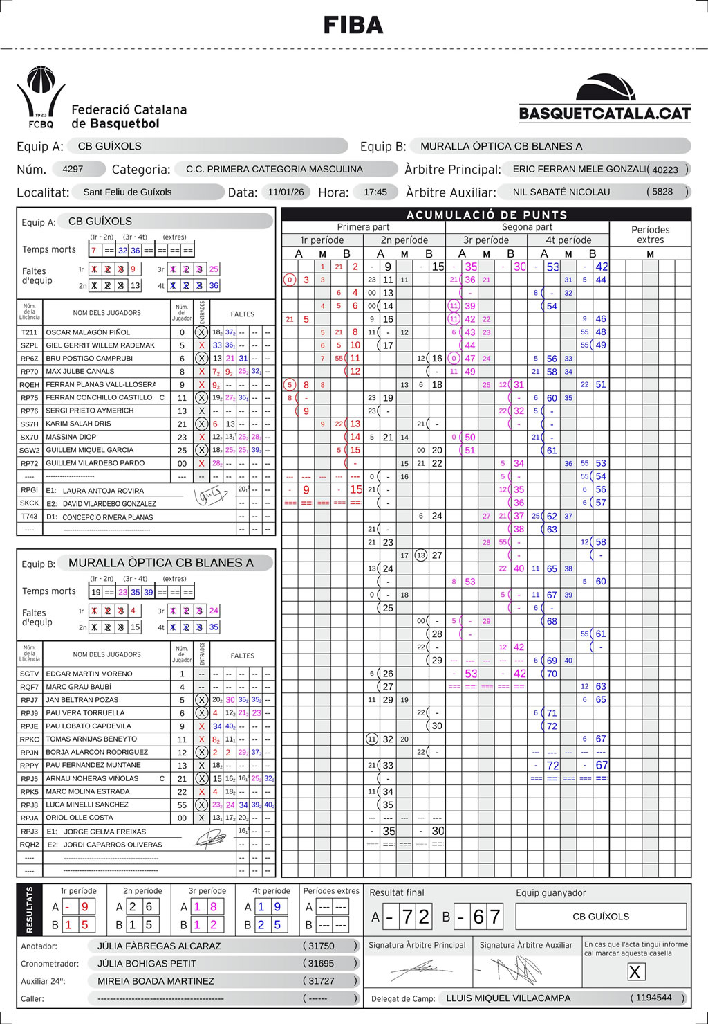 Derrota d’un Muralla Òptica C.B. Blanes que no va mostrar la seva millor versió en el desplaçament a Sant Feliu de Guíxols. El 72-67 final reflecteix una remuntada tardana que, tot i ser meritòria, no va ser suficient per capgirar un partit que es va complicar massa aviat.