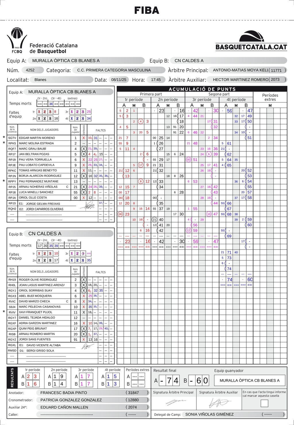 El Muralla Òptica C.B. Blanes va sumar una nova victòria a casa davant un CN Caldes A que no ho va posar gens fàcil. Tot i el resultat final (74-60), l’equip visitant va mostrar un joc ben treballat i un plantejament que va exigir al màxim els blanencs durant els quaranta minuts.