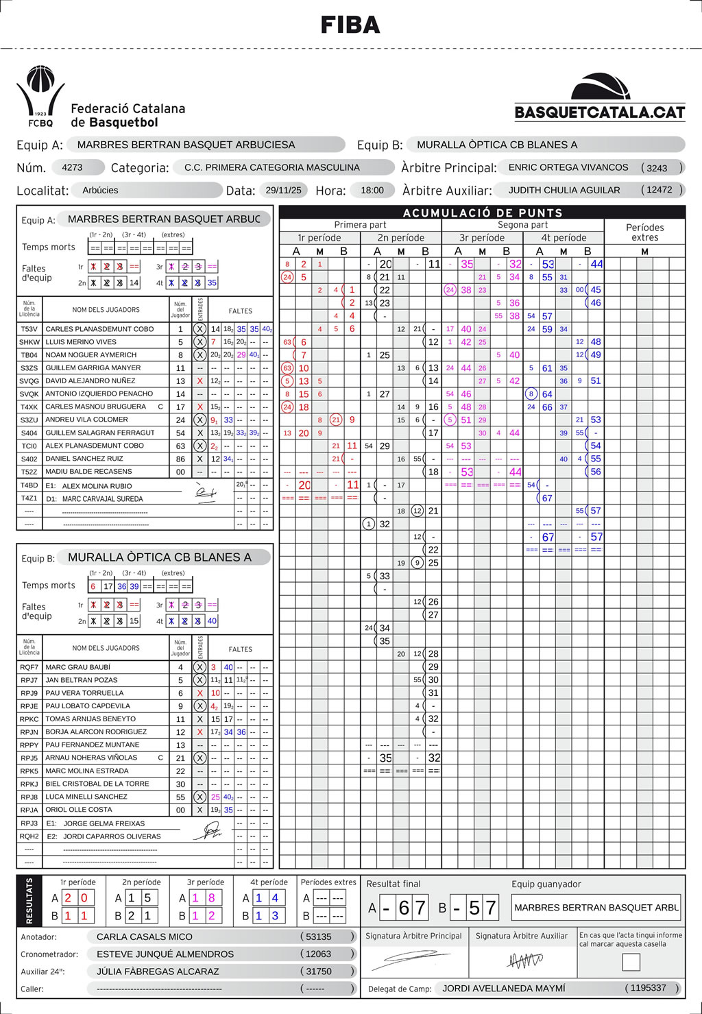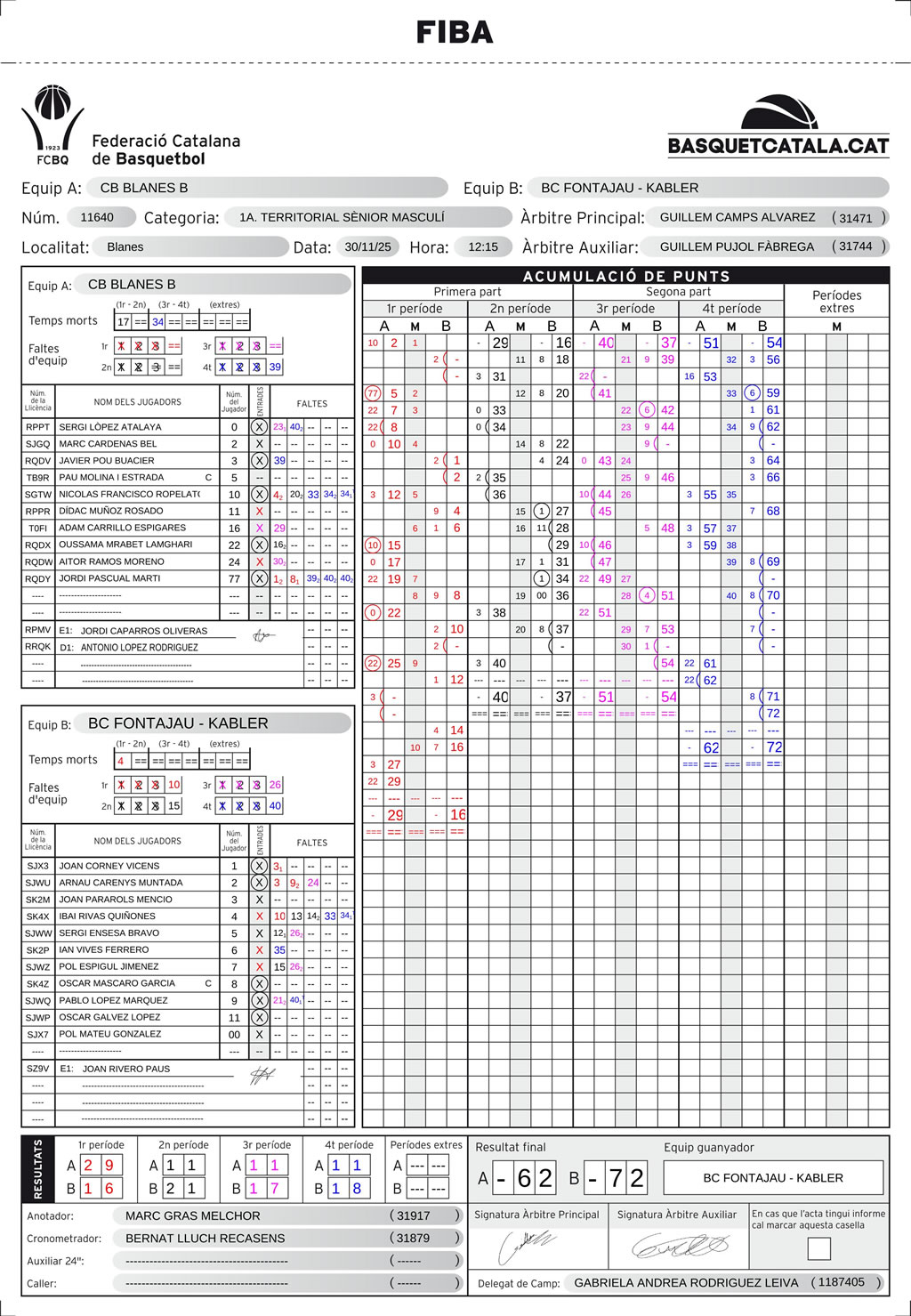 L’equip local va sortir intens des del salt inicial, mostrant un bon domini del ritme i trobant avantatges en les transicions ràpides. Això es va reflectir en el marcador del primer quart (23-16) i del segon (19-14), que deixaven el partit encarat abans del descans. Malgrat no tenir el dia des de la línia de tres (només un 18% d’encert), el Blanes ho va compensar amb un gran treball al contraatac i un encert sòlid des del tir lliure, aprofitant cada tir a la línia.